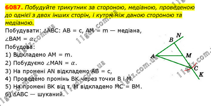 Побудуйте трикутник за стороною, медіаною, проведеною до однієї з двох інших сторін, і кутом між даною стороною та медіаною. Побудувати: ∆АВС: AB = c, AM = m — медіана, ∠BAM = α. Побудова: 1) Відкладемо AM = m. 2) Побудуємо ∠MAN = α. 3) На промені AN відкладемо AB = с, 4) Проведемо промінь BK через точки В і М. 5) На промені BK від т. M відкладемо MC = BM. 6) ∆АВС — шуканий.