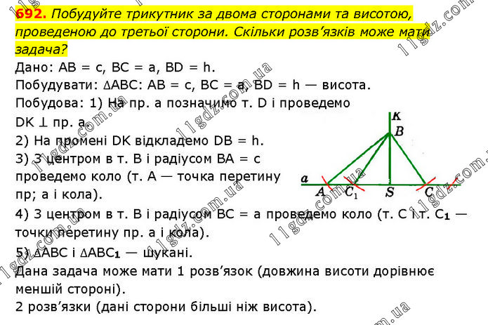 Побудуйте трикутник за двома сторонами та висотою, проведеною до третьої сторони. Скільки розв’язків може мати задача? Дано: AB = с, BC = a, BD = h. Побудувати: ∆ABC: AB = с, BC = а, BD = h — висота. Побудова: 1) Ha пр. а позначимо т. D і проведемо DK ⊥ пр. а. 2) Ha промені DK відкладемо DB = h. 3) 3 центром в т. B i радіусом BA = с проведемо коло (т. А — точка перетину пр; а і кола). 4) 3 центром в т. В і радіусом BC = а проведемо коло (т. C і т. C1 — точки перетину пр. а і кола). 5) ∆ABC і ∆ABC1 — шукані. Дана задача може мати 1 розв’язок (довжина висоти дорівнює меншій стороні). 2 розв’язки (дані сторони більші ніж висота).