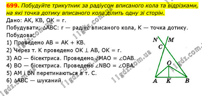 Побудуйте трикутник за радіусом вписаного кола та відрізками, на які точка дотику вписаного кола ділить одну зі сторін. Дано: AK, KB, OK = r. Побудувати: ∆АВС: r — радіус вписаного кола, K — точка дотику. Побудова: 1) Проведемо AB = AK + KB. 2) Через т. K проведемо OK ⊥ AB, OK = r. 3) AO — бісектриса. Проведемо ∠MAO = ∠OAB. 4) BO — бісектриса. Проведемо ∠NBO = ∠OBA. 5) AM і ВN перетинаються в т. С. 6) ∆ABC — шуканий.