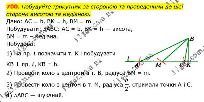 Побудуйте трикутник за стороною та проведеними до цієї сторони висотою та медіаною. Дано: AC = b, BK = h, BM = m. Побудувати: ∆АВС: AC = b, BK = h — висота, BM = m – медіана. Побудова: 1) На пр. ι позначити т. K і побудувати KB ⊥ пр. ι, KB = h. 2) Провести коло з центром в т. В, радіуса BM = m. 3) Провести коло з центом в т. M, радіуса b/2, отримали точки А і С. 4) ∆АВС — шуканий.