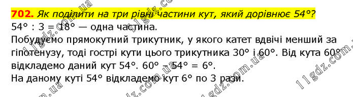 Як поділити на три рівні частини кут, який дорівнює 54°? 54° : 3 = 18° — одна частина. Побудуємо прямокутний трикутник, у якого катет вдвічі менший за гіпотенузу, тоді гострі кути цього трикутника 30° і 60°. Від кута 60° відкладемо даний кут 54°. 60° – 54° = 6°. На даному куті 54° відкладемо кут 6° по 3 рази.