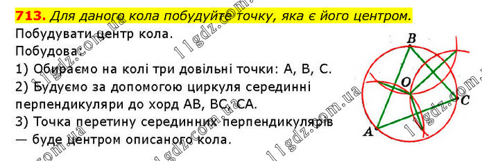 Для даного кола побудуйте точку, яка є його центром. Побудувати центр кола. Побудова: 1) Обираємо на колі три довільні точки: А, В, С. 2) Будуємо за допомогою циркуля серединні перпендикуляри до хорд AB, BC, CA. 3) Точка перетину серединних перпендикулярів — буде центром описаного кола.