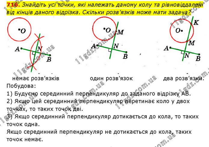Знайдіть усі точки, які належать даному колу та рівновіддалені від кінців даного відрізка. Скільки розв’язків може мати задача? немає розв’язків один розв’язок два розв’язки. Побудова: 1) Будуємо серединний перпендикуляр до заданого відрізку AB. 2) Якщо цей серединний перпендикуляр перетинає коло у двох точках, то таких точок дві. 3) Якщо серединний перпендикуляр дотикається до кола, то таких точок одна. Якщо серединний перпендикуляр не дотикається до кола, таких точок немає.