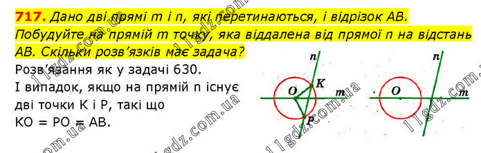 Дано дві прямі m i n, які перетинаються, і відрізок AB. Побудуйте на прямій m точку, яка віддалена від прямої n на відстань AB. Скільки розв’язків має задача? Розв’язання як у задачі 630. І випадок, якщо на прямій n існує дві точки K і P, такі що KO = PO = AB.