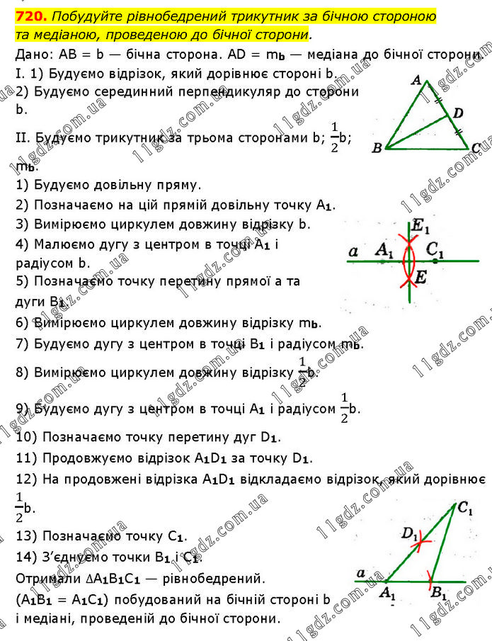 Побудуйте рівнобедрений трикутник за бічною стороною та медіаною, проведеною до бічної сторони. Дано: AB = b — бічна сторона. AD = mb — медіана до бічної сторони. І. 1) Будуємо відрізок, який дорівнює стороні b. 2) Будуємо серединний перпендикуляр до сторони b. II. Будуємо трикутник за трьома сторонами b; 1/2b; mb. 1) Будуємо довільну пряму. 2) Позначаємо на цій прямій довільну точку A1. 3) Вимірюємо циркулем довжину відрізку b. 4) Малюємо дугу з центром в точці A1 і радіусом b. 5) Позначаємо точку перетину прямої а та дуги B1. 6) Вимірюємо циркулем довжину відрізку mb. 7) Будуємо дугу з центром в точці B1 і радіусом mb. 8) Вимірюємо циркулем довжину відрізку 1/2b. 9) Будуємо дугу з центром в точці A1 і радіусом 1/2b. 10) Позначаємо точку перетину дуг D1. 11) Продовжуємо відрізок A1D1 за точку D1. 12) На продовжені відрізка A1D1 відкладаємо відрізок, який дорівнює 1/2b. 13) Позначаємо точку C1. 14) З’єднуємо точки B1 і C1. Отримали ∆A1B1C1 — рівнобедрений. (A1B1 = A1C1) побудований на бічній стороні b і медіані, проведеній до бічної сторони.