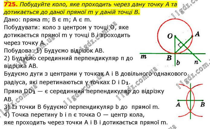 Побудуйте коло, яке проходить через дану точку А та дотикається до даної прямої m у даній точці В. Дано: пряма m; В ∈ m; А ∈ m. Побудувати: коло з центром у точці O, яке дотикається прямої m у точці В і проходить через точку А. Побудова: 1) Будуємо відрізок AB. 2) Будуємо серединний перпендикуляр п до відрізка AB. Будуємо дуги з центрами у точках A i B довільного однакового радіуса, які перетинаються у точках D і D1. Пряма DD1 — є серединний перпендикуляр до відрізку AB. 3) Із точки В будуємо перпендикуляр b до прямої m. 4) Точка перетину b i n є точка O — центр кола, яке проходить через точки А і В і дотикається прямої m.