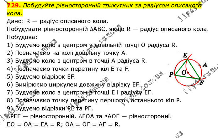 Побудуйте рівносторонній трикутник за радіусом описаного кола. Дано: R — радіус описаного кола. Побудувати рівносторонній ∆ABC, якщо R — радіус описаного кола. Побудова: 1) Будуємо коло з центром у довільній точці O радіуса R. 2) Позначаємо на колі довільну точку А. 3) Будуємо коло з центром в точці А радіуса R. 4) Позначаємо точки перетину кіл E та F. 5) Будуємо відрізок EF. 6) Вимірюємо циркулем довжину відрізку EF. 7) Будуємо коло з центром в точці E і радіусу EF. 8) Позначаємо точку перетину першого і останнього кіл P. 9) Будуємо відрізки PE та PF. ∆PEF — рівносторонній. ∆EOA та ∆AOF — рівносторонні. EO = OA = EA = R; OA = OF = AF = R.
