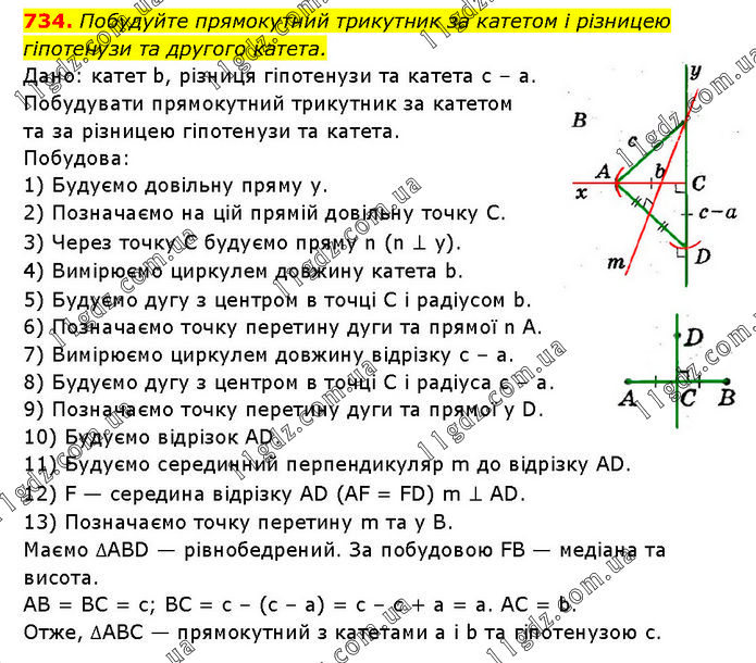 Побудуйте прямокутний трикутник за катетом і різницею гіпотенузи та другого катета. Дано: катет b, різниця гіпотенузи та катета с – a. Побудувати прямокутний трикутник за катетом та за різницею гіпотенузи та катета. Побудова: 1) Будуємо довільну пряму у. 2) Позначаємо на цій прямій довільну точку С. 3) Через точку C будуємо пряму n (n ⊥ y). 4) Вимірюємо циркулем довжину катета b. 5) Будуємо дугу з центром в точці C і радіусом b. 6) Позначаємо точку перетину дуги та прямої n А. 7) Вимірюємо циркулем довжину відрізку с – а. 8) Будуємо дугу з центром в точці C і радіуса с – а. 9) Позначаємо точку перетину дуги та прямої у D. 10) Будуємо відрізок AD. 11) Будуємо серединний перпендикуляр m до відрізку AD. 12) F — середина відрізку AD (AF = FD) m ⊥ AD. 13) Позначаємо точку перетину m та у В. Маємо ∆ABD — рівнобедрений. За побудовою FB — медіана та висота. AB = BC = с; BC = с – (с – а) = с – с + а = а. AC = b. Отже, ∆ABC — прямокутний з катетами а і b та гіпотенузою с.