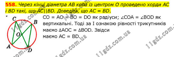 Через кінці діаметра AB кола із центром O проведено хорди AC і BD такі, що AC||BD. Доведіть, що AC = BD. СО = АО = ВО = DO як радіуси; ∠COA = ∠BOD як вертикальні. Тоді за І ознакою рівності трикутників маємо ∆AOC = ∆BOD. Звідси маємо AС = ВD.
