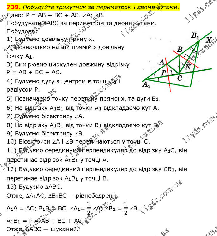 Побудуйте трикутник за периметром і двома кутами. Дано: P = AB + BC + AC. ∠A; ∠B. Побудувати ∆АВС за периметром та двома кутами. Побудова: 1) Будуємо довільну пряму х. 2) Позначаємо на цій прямій х довільну точку A1. 3) Вимірюємо циркулем довжину відрізку P = AB + BC + AC. 4) Будуємо дугу з центром в точці A1 і радіусом Р. 5) Позначаємо точку перетину прямої х, та дуги B1. 6) На відрізку A1B1 від точки A1 відкладаємо кут А. 7) Будуємо бісектрису ∠A. 8) На відрізку A1B1 від точки B1 відкладаємо кут В. 9) Будуємо бісектрису ∠B. 10) Бісектриси ∠A і ∠B перетинаються у точці С. 11) Будуємо серединний перпендикуляр до відрізку A1C, він перетинає відрізок A1B1 у точці А. 12) Будуємо серединний перпендикуляр до відрізку CB1, він перетинає відрізок A1B1 у точці В. 13) Будуємо ∆АВС. Отже, ∆A1AC, ∆B1BC — рівнобедрені. A1A = AC; B1B = BC. ∠A1= 1/2 ∠A; ∠B1 = 1/2 ∠B. A1B1 = P = AB + BC + AC. Отже, ∆АВС — шуканий.
