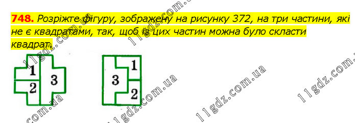 Розріжте фігуру, зображену на рисунку 372, на три частини, які не є квадратами, так, щоб із цих частин можна було скласти квадрат.
