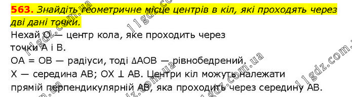 Знайдіть геометричне місце центрів в кіл, які проходять через дві дані точки. Нехай O — центр кола, яке проходить через точки А і В. OA = OB — радіуси, тоді ∆AOB — рівнобедрений. X — середина AB; OX ⊥ AB. Центри кіл можуть належати прямій перпендикулярній AB, яка проходить через середину AB.