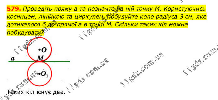 Проведіть пряму а та позначте на ній точку М. Користуючись косинцем, лінійкою та циркулем, побудуйте коло радіуса 3 см, яке дотикалося б до прямої а в точці М. Скільки таких кіл можна побудувати? Таких кіл існує два.