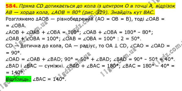 Пряма CD дотикається до кола із центром O в точці А, відрізок AB — хорда кола, ∠AOB = 80° (рис. 329). Знайдіть кут ВАС. Розглянемо ∆AOB — рівнобедрений (AO = OB = В), тоді ∠OAB = ∠OBA. ∠AOB + ∠OAB + ∠OBA = 180°; ∠OAB + ∠OBA = 180° – 80°; ∠OAB + ∠OBA = 100°; ∠OAB = ∠OBA = 100° : 2 = 50°. CD — дотична до кола, OA — радіус, то OA ⊥ CD, ∠CAO = ∠OAD = 90°. ∠OAD = ∠OAB + ∠BAD; 90° = 50° + ∠BAD; ∠BAD = 90° – 50° = 40°. ∠BAD і ∠BAC — суміжні. ∠BAD + ∠BAC = 180°; ∠BAC = 180° – 40° = 140°. Відповідь: ∠BAC = 140°.