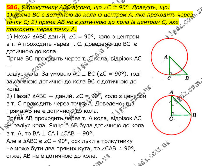 У трикутнику ABC відомо, що ∠C = 90°. Доведіть, що: 1) пряма BC є дотичною до кола із центром А, яке проходить через точку С; 2) пряма AB не є дотичною до кола із центром С, яке проходить через точку А. 1) Нехай ∆ABC даний, ∠C = 90°, коло з центром в т. А проходить через т. С. Доведемо що BC є дотичною до кола. Пряма BC проходить через т. C кола, відрізок AC — радіус кола. За умовою AC ⊥ BC (∠C = 90°), тоді за ознакою дотичної до кола BC є дотичною до кола. 2) Нехай ∆ABC — даний, ∠C = 90°, коло з центром в т. C проходить через точку А. Доведемо, що пряма AB не є дотичною до кола. Пряма AB проходить через т. А кола, відрізок AC — радіус кола. Якщо б AB була дотичною до кола в т. А, то BA ⊥ CA і ∠CAB = 90°. Але в ∆ABC є ∠C – 90°, оскільки в трикутнику не може бути два прямих кута, то ∠CAB ≠ 90°, отже, AB не е дотичною до кола.