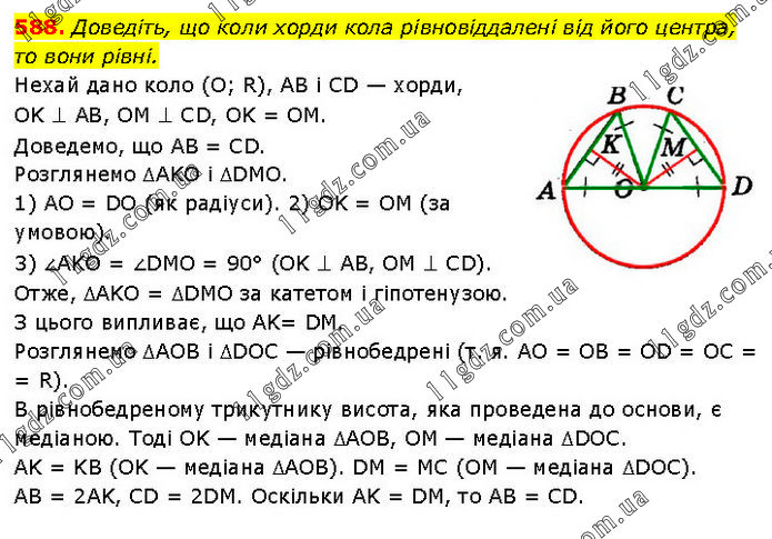 Доведіть, що коли хорди кола рівновіддалені від його центра, то вони рівні. Нехай дано коло (О; R), AB і CD — хорди, OK ⊥ AB, OM ⊥ CD, OK = ОМ. Доведемо, що AB = CD. Розглянемо ∆AKO і ∆DMO. 1) AO = DO (як радіуси). 2) OK = OM (за умовою). 3) ∠AKO = ∠DMO = 90° (OK ⊥ AB, OM ⊥ CD). Отже, ∆AKO = ∆DMO за катетом і гіпотенузою. З цього випливає, що AK= DM. Розглянемо ∆AOB і ∆DOC — рівнобедрені (т. я. AO = OB = OD = OC = R). В рівнобедреному трикутнику висота, яка проведена до основи, є медіаною. Тоді OK — медіана ∆AOB, OM — медіана ∆DOC. AK = KB (OK — медіана ∆AOB). DM = MC (ОМ — медіана ∆DOC). AB = 2AK, CD = 2DM. Оскільки AK = DM, то AB = CD.