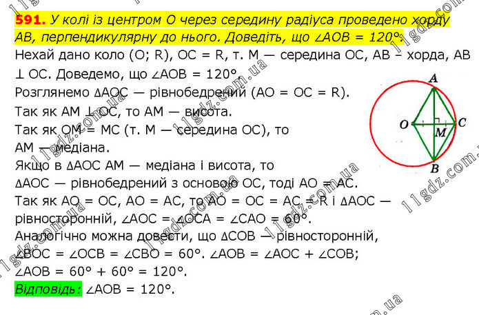 У колі із центром O через середину радіуса проведено хорду AB, перпендикулярну до нього. Доведіть, що ∠AOB = 120°. Нехай дано коло (О; R), OC = R, т. M — середина ОС, AB – хорда, AB ⊥ ОС. Доведемо, що ∠AOB = 120°. Розглянемо ∆AOC — рівнобедрений (AO = OC = R). Так як AM ⊥ ОС, то AM — висота. Так як OM = MC (т. M — середина ОС), то AM — медіана. Якщо в ∆AOC AM — медіана і висота, то ∆AOC — рівнобедрений з основою ОС, тоді AO = AC. Так як AO = ОС, AO = AC, то AO = OC = AC = R i ∆AOC — рівносторонній, ∠AOC = ∠OCA = ∠CAO = 60°. Аналогічно можна довести, що ∆COB — рівносторонній, ∠BOC = ∠OCB = ∠CBO = 60°. ∠AOB = ∠AOC + ∠COB; ∠AOB = 60° + 60° = 120°. Відповідь: ∠AOB = 120°.