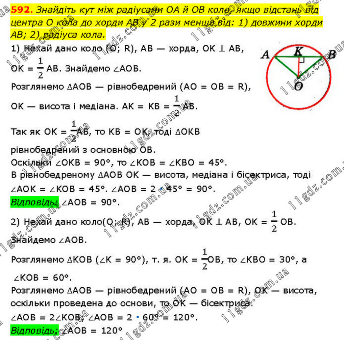 Знайдіть кут між радіусами OA й OB кола, якщо відстань від центра O кола до хорди AB у 2 рази менша від: 1) довжини хорди AB; 2) радіуса кола. 1) Нехай дано коло (О; R), AB — хорда, OK ⊥ AB, OK = 1/2 AB. Знайдемо ∠AOB. Розглянемо ∆AOB — рівнобедрений (AO = OB = R), OK — висота і медіана. AK = KB = 1/2 AB. Так як OK = 1/2AB, то KB = OK, тоді ∆OКВ рівнобедрений з основною ОB. Оскільки ∠OKB = 90°, то ∠KOB = ∠KBO = 45°. В рівнобедреному ∆AOB OK — висота, медіана і бісектриса, тоді ∠AOK = ∠KOB = 45°. ∠AOB = 2 ∙ 45° = 90°. Відповідь: ∠AOB = 90°. 2) Нехай дано коло(O; R), AB — хорда, OK ⊥ AB, OK = 1/2 OB. Знайдемо ∠AOB. Розглянемо ∆KOB (∠K = 90°), т. я. OK = 1/2OB, то ∠KBO = 30°, a ∠KOB = 60°. Розглянемо ∆AOB — рівнобедрений (AO = OB = R), OK — висота, оскільки проведена до основи, то OK — бісектриса. ∠AOB = 2∠KOB; ∠AOB = 2 ∙ 60° = 120°. Відповідь: ∠AOB = 120°.