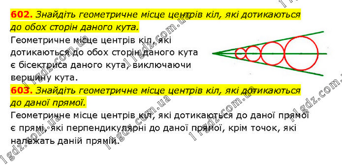 602. Знайдіть геометричне місце центрів кіл, які дотикаються до обох сторін даного кута. Геометричне місце центрів кіл, які дотикаються до обох сторін даного кута є бісектриса даного кута, виключаючи вершину кута. 603. Знайдіть геометричне місце центрів кіл, які дотикаються до даної прямої. Геометричне місце центрів кіл, які дотикаються до даної прямої є прямі, які перпендикулярні до даної прямої, крім точок, які належать даній прямій.
