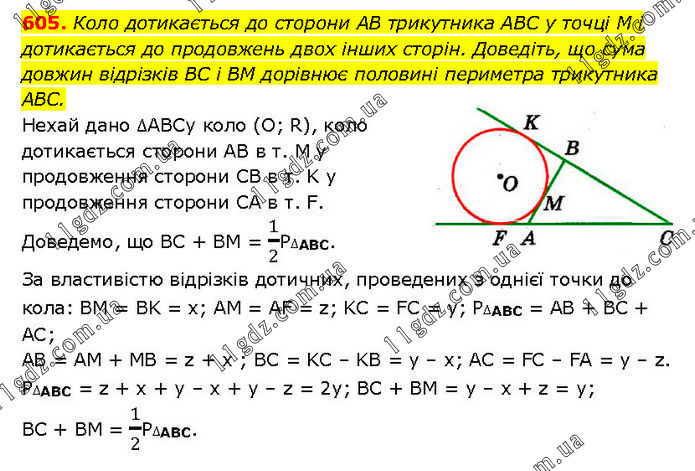 Коло дотикається до сторони AB трикутника ABC у точці M і дотикається до продовжень двох інших сторін. Доведіть, що сума довжин відрізків BC і BM дорівнює половині периметра трикутника ABC. Нехай дано ∆ABCy коло (О; R), коло дотикається сторони AB в т. M y продовження сторони CB в т. K y продовження сторони CA в т. F. Доведемо, що BC + BM = 1/2P∆ABC. За властивістю відрізків дотичних, проведених з однієї точки до кола: BM = BK = х; AM = AF = z; KC = FC = y; P∆ABC = AB + BC + AC; AB = AM + МВ = z + х ; BС = KС – KВ = у – х; АС = FС – FА = у – z. P∆ABC = z + x + y – x + y – z = 2y; BC + BM = у – х + z = у; BC + BM = 1/2P∆ABC.