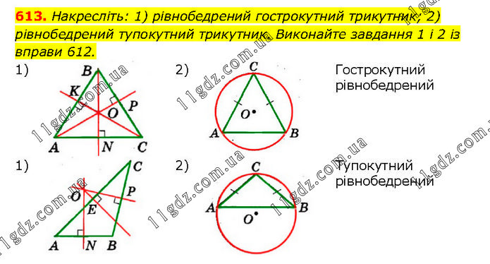 Накресліть: 1) рівнобедрений гострокутний трикутник; 2) рівнобедрений тупокутний трикутник. Виконайте завдання 1 і 2 із вправи 612.