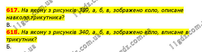 617. На якому з рисунків 339, а, б, в, зображено коло, описане навколо трикутника? В. 618. На якому з рисунків 340, а, б, в, зображено коло, вписане в трикутник? Б.
