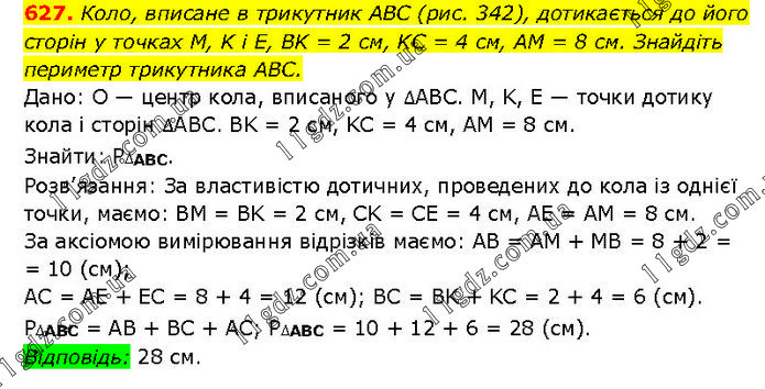 Коло, вписане в трикутник ABC (рис. 342), дотикається до його сторін у точках М, K і Е, BK = 2 см, KC = 4 см, AM = 8 см. Знайдіть периметр трикутника ABC. Дано: O — центр кола, вписаного у ∆ABC. M, K, E — точки дотику кола і сторін ∆АВС. BK = 2 см, KC = 4 см, AM = 8 см. Знайти: Р∆ABC. Розв’язання: За властивістю дотичних, проведених до кола із однієї точки, маємо: BM = BK = 2 см, CK = CE = 4 см, AE = AM = 8 см. За аксіомою вимірювання відрізків маємо: AB = AM + MB = 8 + 2 = 10 (см); AC = AE + EC = 8 + 4 = 12 (см); BC = ВK + KC = 2 + 4 = 6 (см). Р∆ABC = АВ + ВС + AC; Р∆ABC = 10 + 12 + 6 = 28 (см). Відповідь: 28 см.