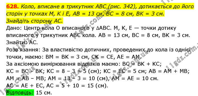 Коло, вписане в трикутник ABC (рис. 342), дотикається до його сторін у точках М, K і Е, AB = 13 см, BC = 8 см, BK = 3 см. Знайдіть сторону AC. Дано: Центр кола O вписаного у ∆ABC. M, K, E — точки дотику вписаного у трикутник ABC кола. AB = 13 см, BC = 8 см, BK = 3 см. Знайти: AC. Розв'язання: За властивістю дотичних, проведених до кола із однієї точки, маємо: BM = BK = 3 см, CK = CE, AE = AM. За аксіомою вимірювання відрізків маємо: BC = BK + KC; KC = BC – BK; KC = 8 – 3 = 5 (см); KC = EC = 5 см; AB = AM + MB; AM = AB – MB; AM = 13 – 3 = 10 (см), AM = AE = 10 см. AC = AE + EC, AC = 5 + 10 = 15 (см). Відповідь: 15 см.