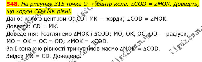 На рисунку 315 точка O — центр кола, ∠COD = ∠MOK. Доведіть, що хорди CD і MK рівні. Дано: коло з центром О; CD і MK — хорди; ∠COD = ∠MOK. Довести: CD = MK. Доведення: Розглянемо ∆MOK і ∆COD; MO, OK, ОС, OD — радіуси; MO = OK = OC = OD; ∠MOK = ∠COD. За І ознакою рівності трикутників маємо ∆MOK = ∆COD. Звідси MX = CD. Доведено.