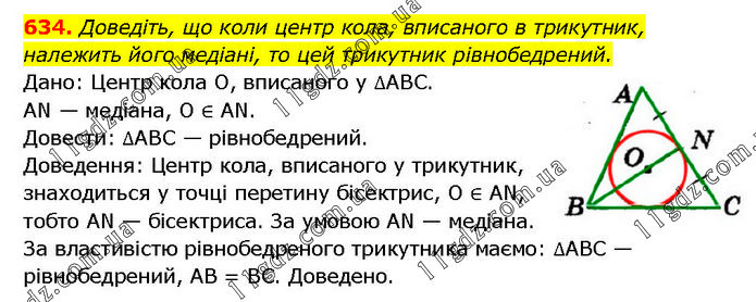 Доведіть, що коли центр кола, вписаного в трикутник, належить його медіані, то цей трикутник рівнобедрений. Дано: Центр кола O, вписаного у ∆ABC. AN — медіана, O ∈ AN. Довести: ∆ABC — рівнобедрений. Доведення: Центр кола, вписаного у трикутник, знаходиться у точці перетину бісектрис, O ∈ AN, тобто AN — бісектриса. За умовою AN — медіана. За властивістю рівнобедреного трикутника маємо: ∆ABC — рівнобедрений, AB = BC. Доведено.