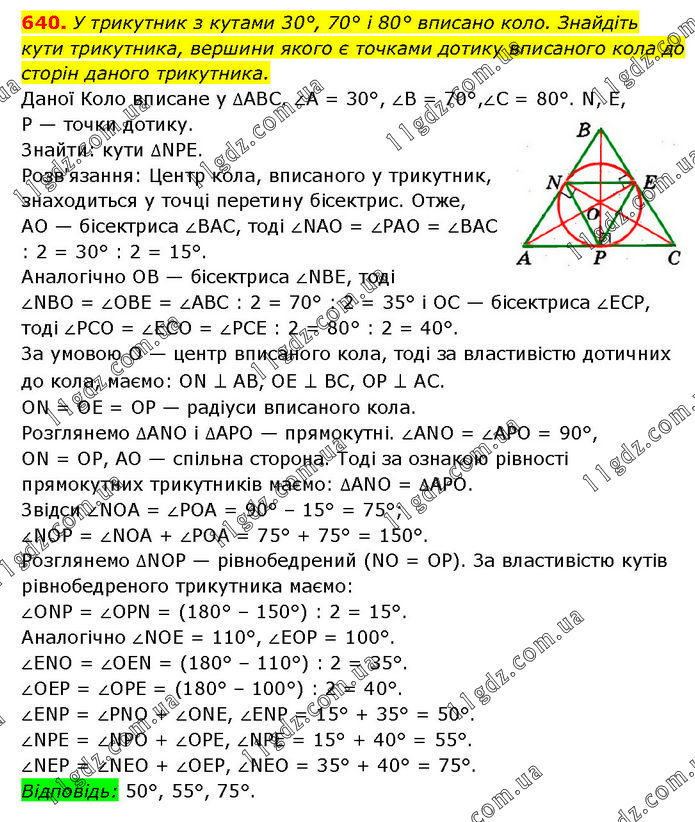 У трикутник з кутами 30°, 70° і 80° вписано коло. Знайдіть кути трикутника, вершини якого є точками дотику вписаного кола до сторін даного трикутника. Даної Коло вписане у ∆ABC. ∠A = 30°, ∠B = 70°,∠C = 80°. N, E, P — точки дотику. Знайти: кути ∆NPE. Розв'язання: Центр кола, вписаного у трикутник, знаходиться у точці перетину бісектрис. Отже, AO — бісектриса ∠BAC, тоді ∠NAO = ∠PAO = ∠BAC : 2 = 30° : 2 = 15°. Аналогічно ОB — бісектриса ∠NBE, тоді ∠NBO = ∠OBE = ∠ABC : 2 = 70° : 2 = 35° і OC — бісектриса ∠ECP, тоді ∠PCO = ∠ECO = ∠PCE : 2 = 80° : 2 = 40°. За умовою O — центр вписаного кола, тоді за властивістю дотичних до кола, маємо: ON ⊥ AB, OE ⊥ BС, OP ⊥ AC. ON = OE = OP — радіуси вписаного кола. Розглянемо ∆ANO і ∆APO — прямокутні. ∠ANO = ∠APO = 90°, ON = OP, AO — спільна сторона. Тоді за ознакою рівності прямокутних трикутників маємо: ∆ANO = ∆APO. Звідси ∠NOA = ∠POA = 90° – 15° = 75°; ∠NOP = ∠NOA + ∠POA = 75° + 75° = 150°. Розглянемо ∆NOP — рівнобедрений (NO = OP). За властивістю кутів рівнобедреного трикутника маємо: ∠ONP = ∠OPN = (180° – 150°) : 2 = 15°. Аналогічно ∠NOE = 110°, ∠EOP = 100°. ∠ENO = ∠OEN = (180° – 110°) : 2 = 35°. ∠OEP = ∠OPE = (180° – 100°) : 2 = 40°. ∠ENP = ∠PNO + ∠ONE, ∠ENP = 15° + 35° = 50°. ∠NPE = ∠NPO + ∠OPE, ∠NPE = 15° + 40° = 55°. ∠NEP = ∠NEO + ∠OEP, ∠NEO = 35° + 40° = 75°. Відповідь: 50°, 55°, 75°.