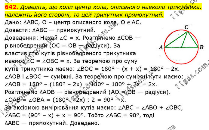 Доведіть, що коли центр кола, описаного навколо трикутника, належить його стороні, то цей трикутник прямокутний. Дано: ∆АВС, O – центр описаного кола, O ∈ AC. Довести: ∆АВС — прямокутний. Доведення: Нехай ∠C = x. Розглянемо ∆COB — рівнобедрений (ОС = OB — радіуси). За властивістю кутів рівнобедреного трикутника маємо: ∠C = ∠OBC = x. За теоремою про суму кутів трикутника маємо: ∠BOC = 180° – (х + x) = 180° – 2x. ∠AOB і ∠BOC — суміжні. За теоремою про суміжні кути маємо: ∠AOB = 180° – (180° – 2x) = 180° – 180° + 2х = 2x. Розглянемо ∆AOB — рівнобедрений (AO = OB — радіуси). ∠OAB = ∠OBA = (180° – 2x) : 2 = 90° – x. За аксіомою вимірювання кутів маємо: ∠ABC = ∠ABO + ∠OBC, ∠ABC = (90° – x) + х = 90°. Тобто ∠ABC = 90°, тоді ∆АВС — прямокутний. Доведено.