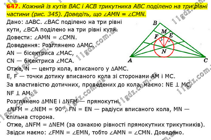 Кожний із кутів ВАС і ACB трикутника ABC поділено на три рівні частини (рис. 345). Доведіть, що ∠AMN = ∠CMN. Дано: ∆АВС. ∠BAC поділено на три рівні кути, ∠BCA поділено на три рівні кути. Довести: ∠AMN = ∠CMN. Доведення: Розглянемо ∆AMC. AN — бісектриса ∠MAC, CN — бісектриса ∠MCA. Отже, N — центр кола, вписаного у ∆АМС. E, F — точки дотику вписаного кола зі сторонами AM і MC. За властивістю дотичних, проведених до кола, маємо: NE ⊥ MC, NF ⊥ AM. Розглянемо ∆MNE і ∆NFM — прямокутні. ∠NFM = ∠NEM = 90°, FN = EN — радіуси вписаного кола, MN — спільна сторона. Отже, ∆NFM = ∆NEM (за ознакою рівності прямокутних трикутників). Звідси маємо: ∠FMN = ∠EMN, тобто ∠AMN = ∠CMN. Доведено.