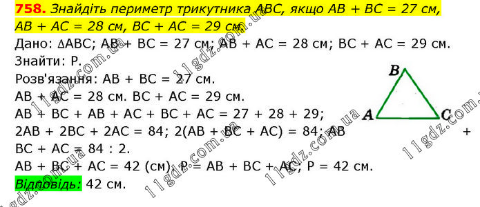 Знайдіть периметр трикутника ABC, якщо AB + BC = 27 см, АВ + АС = 28 см, ВС + АС = 29 см. Дано: ∆ABC; AB + BC = 27 см; AB + AC = 28 см; BC + AC = 29 см. Знайти: P. Розв'язання: AB + BC = 27 см. AB + AC = 28 см. BC + AC = 29 см. AB + BC + AB + AC + BC + AC = 27 + 28 + 29; 2AB + 2BC + 2АС = 84; 2(АВ + BC + AC) = 84; AB + BC + AC = 84 : 2. AB + BC + AC = 42 (см). P = AB + BC + AC; P = 42 см. Відповідь: 42 см.