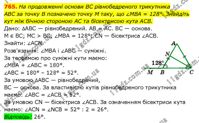 На продовженні основи BC рівнобедреного трикутника ABC за точку В позначено точку M таку, що ∠MBA = 128°. Знайдіть кут між бічною стороною AC та бісектрисою кута ACB. Дано: ∆ABC — рівнобедрений. AB = AC. BC — основа. M ∈ BC; MC > BC; ∠MBA = 128°; CN — бісектриса ∠ACB. Знайти: ∠ACN. Розв'язання: ∠MBA і ∠ABC — суміжні. За теоремою про суміжні кути маємо: ∠MBA + ∠ABC = 180°. ∠ABC = 180° – 128° = 52°. За умовою ∆ABC — рівнобедрений, BC — основа. За властивістю кутів рівнобедреного трикутника маємо: ∠ABC = ∠ACB = 52°. За умовою CN — бісектриса ∠ACB. За означенням бісектриси кута маємо: ∠ACN = ∠NCB = 52° : 2 = 26°. Відповідь: 26°.