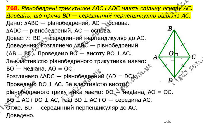 Рівнобедрені трикутники ABC і ADC мають спільну основу AC. Доведіть, що пряма BD — серединний перпендикуляр відрізка AC. Дано: ∆ABC — рівнобедрений, AC — основа. ∆ADC — рівнобедрений, AC — основа. Довести: BD — серединний перпендикуляр до AC. Доведення: Розглянемо ∆АВС — рівнобедрений (AB = BC). Проведемо BO — висоту BO ⊥ AC. За властивістю рівнобедреного трикутника маємо: BO — медіана, AO = ОС. Розглянемо ∆ADC — рівнобедрений (AD = DC). Проведемо DO ⊥ AC. За властивістю висоти рівнобедреного трикутника маємо: DO — медіана, AO = ОС. BO ⊥ AC і DO ⊥ AC, тоді BD ⊥ AC і O — середина AC. Отже, BD — серединний перпендикуляр до AC. Доведено.