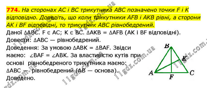 На сторонах AC і BC трикутника ABC позначено точки F i K відповідно. Доведіть, що коли трикутники AFB i AKB рівні, а сторони AK і BF відповідні, то трикутник ABC рівнобедрений. Даної ∆ABC. F ∈ AC; K ∈ BC. ∆AKB = ∆AFB (АK і BF відповідні). Довести: ∆ABC — рівнобедрений. Доведення: За умовою ∆ABK = ∆BAF. Звідси маємо: ∠BAF = ∠ABK. За властивістю кутів при основі рівнобедреного трикутника маємо: ∆ABC — рівнобедрений (AB — основа). Доведено.