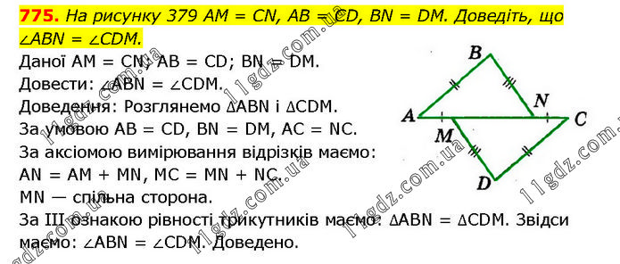 На рисунку 379 AM = CN, AB = CD, BN = DM. Доведіть, що ∠ABN = ∠CDM. Даної AM = CN; AB = CD; BN = DM. Довести: ∠ABN = ∠CDM. Доведення: Розглянемо ∆ABN і ∆CDM. За умовою AB = CD, BN = DM, AC = NC. За аксіомою вимірювання відрізків маємо: AN = AM + MN, MC = MN + NC. MN — спільна сторона. За III ознакою рівності трикутників маємо: ∆ABN = ∆CDM. Звідси маємо: ∠ABN = ∠CDM. Доведено.