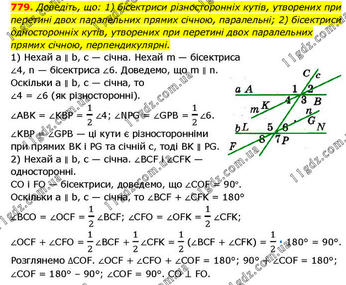 Доведіть, що: 1) бісектриси різносторонніх кутів, утворених при перетині двох паралельних прямих січною, паралельні; 2) бісектриси односторонніх кутів, утворених при перетині двох паралельних прямих січною, перпендикулярні. 1) Нехай а ∥ b, с — січна. Нехай m — бісектриса ∠4, n — бісектриса ∠6. Доведемо, що m ∥ n. Оскільки а ∥ b, с — січна, то ∠4 = ∠6 (як різносторонні). ∠ABK = ∠KBP = 1/2 ∠4; ∠NPG = ∠GPB = 1/2∠6. ∠KBP = ∠GPB — ці кути є різносторонніми при прямих BK і PG та січній с, тоді BK ∥ PG. 2) Нехай а ∥ b, с — січна. ∠BCF і ∠CFK — односторонні. CO і FO — бісектриси, доведемо, що ∠COF = 90°. Оскільки а ∥ b, с — січна, то ∠BCF + ∠CFK = 180° ∠BCO = ∠OCF = 1/2 ∠BCF; ∠CFO = ∠OFK = 1/2 ∠CFK; ∠OCF + ∠CFO = 1/2∠BCF + 1/2∠CFK = 1/2 (∠BCF + ∠CFK) = 1/2 ∙ 180° = 90°. Розглянемо ∆COF. ∠OCF + ∠CFO + ∠COF = 180°; 90° + ∠COF = 180°; ∠COF = 180° – 90°; ∠COF = 90°. CO ⊥ FO.