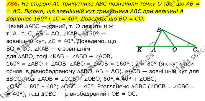 На стороні AC трикутника ABC позначили точку O так, що AB = AO. Відомо, що зовнішній кут трикутника ABC при вершині А дорівнює 160° і ∠C = 40°. Доведіть, що BO = CO. Нехай ∆ABC — даний, т. O лежить між т. А і т. C, AB = AO, ∠KAB = 160° — зовнішній кут, ∠C = 40°. Доведемо, що BO = CO. ∠KAB — є зовнішнім для ∆АВО, тоді ∠KAB = ∠ABO + ∠AОВ, 160° = ∠ABO + ∠AOB. ∠ABO = ∠AOB = 160° : 2 = 80° (як кути при основі в рівнобедреному ∆ABO, AB = AO). ∆AOB — зовнішній кут для ∆BOC, тоді ∠AOB = ∠OCB + ∠OBO, 80° = 40° + ∠OBC; ∠OSC = 80° – 40°; ∠OBC = 40°. Розглянемо ∆OBC (∠OCB = ∠OBC = 40°), тоді ∆OBC — рівнобедрений і OB = ОС.