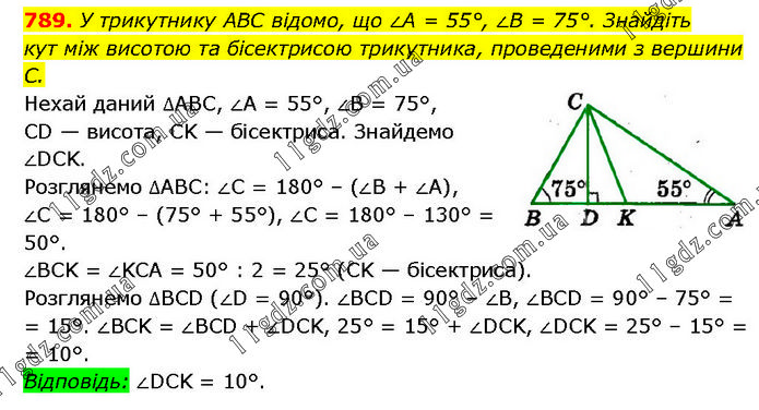 У трикутнику ABC відомо, що ∠A = 55°, ∠B = 75°. Знайдіть кут між висотою та бісектрисою трикутника, проведеними з вершини С. Нехай даний ∆ABC, ∠A = 55°, ∠B = 75°, CD — висота, CK — бісектриса. Знайдемо ∠DCK. Розглянемо ∆АВС: ∠C = 180° – (∠B + ∠A), ∠C = 180° – (75° + 55°), ∠C = 180° – 130° = 50°. ∠BCK = ∠KCA = 50° : 2 = 25° (CK — бісектриса). Розглянемо ∆BCD (∠D = 90°). ∠BCD = 90° – ∠B, ∠BCD = 90° – 75° = 15°. ∠BCK = ∠BCD + ∠DCK, 25° = 15° + ∠DCK, ∠DCK = 25° – 15° = 10°. Відповідь: ∠DCK = 10°.