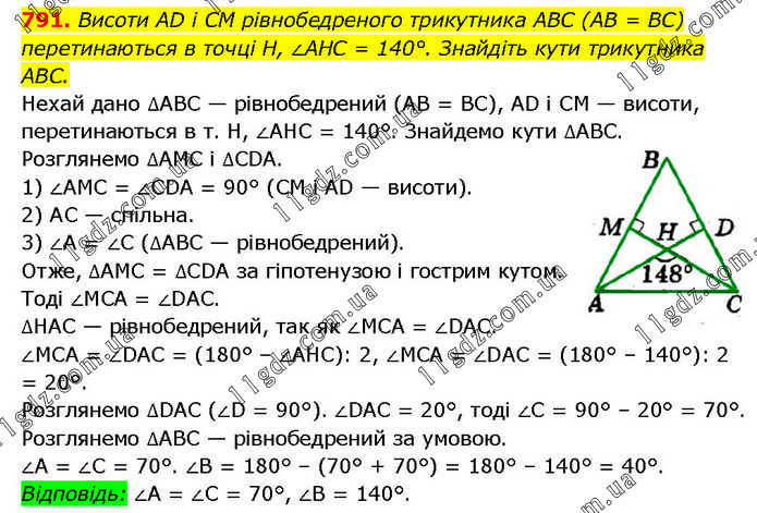 Висоти AD і CM рівнобедреного трикутника ABC (AB = BC) перетинаються в точці Н, ∠AHC = 140°. Знайдіть кути трикутника ABC. Нехай дано ∆АВС — рівнобедрений (AB = BC), AD і CM — висоти, перетинаються в т. H, ∠AHC = 140°. Знайдемо кути ∆АВС. Розглянемо ∆AMC і ∆CDA. 1) ∠AMC = ∠CDA = 90° (CM і AD — висоти). 2) AC — спільна. 3) ∠A = ∠C (∆АВС — рівнобедрений). Отже, ∆AMC = ∆CDA за гіпотенузою і гострим кутом. Тоді ∠MCA = ∠DAC. ∆НАС — рівнобедрений, так як ∠MCA = ∠DAC. ∠MCA = ∠DAC = (180° – ∠AHC) : 2, ∠MCA = ∠DAC = (180° – 140°) : 2 = 20°. Розглянемо ∆DAC (∠D = 90°). ∠DAC = 20°, тоді ∠C = 90° – 20° = 70°. Розглянемо ∆АВС — рівнобедрений за умовою. ∠A = ∠C = 70°. ∠B = 180° – (70° + 70°) = 180° – 140° = 40°. Відповідь: ∠A = ∠C = 70°, ∠B = 140°.