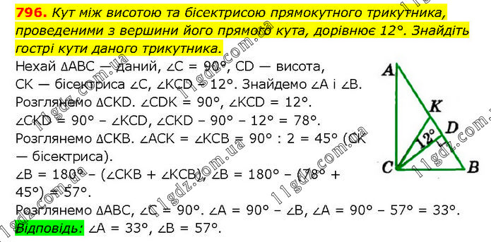 Кут між висотою та бісектрисою прямокутного трикутника, проведеними з вершини його прямого кута, дорівнює 12°. Знайдіть гострі кути даного трикутника. Нехай ∆АВС — даний, ∠C = 90°, CD — висота, CK — бісектриса ∠C, ∠KCD – 12°. Знайдемо ∠A і ∠B. Розглянемо ∆CKD. ∠CDK = 90°, ∠KCD = 12°. ∠CKD = 90° – ∠KCD, ∠CKD – 90° – 12° = 78°. Розглянемо ∆СКВ. ∠ACK = ∠KCB = 90° : 2 = 45° (CK — бісектриса). ∠B = 180° – (∠CKB + ∠KCB), ∠B = 180° – (78° + 45°) = 57°. Розглянемо ∆АВС, ∠C = 90°. ∠A = 90° – ∠B, ∠A = 90° – 57° = 33°. Відповідь: ∠A = 33°, ∠B = 57°.
