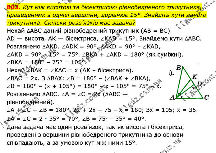 Кут між висотою та бісектрисою рівнобедреного трикутника, проведеними з однієї вершини, дорівнює 15°. Знайдіть кути даного трикутника. Скільки розв’язків має задача? Нехай ∆АВС даний рівнобедрений трикутник (AB = BC). AD — висота, AK — бісектриса, ∠KAD = 15°. Знайдемо кути ∆АВС. Розглянемо ∆AKD. ∠ADK = 90°, ∠AKD = 90° – ∠KAD, ∠AKD = 90° – 15° = 75°. ∠BKA + ∠AKD = 180° (як суміжні). ∠BKA = 180° – 75° = 105°. Нехай ∠BAK = ∠KAC = х (AK – бісектриса). ∠BAC = 2х. З ∆ВАХ: ∠B = 180° – (∠BAK + ∠BКA), ∠B = 180° – (х + 105°) = 180° – х – 105° = 75° – х. Розглянемо ∆АВС. ∠A = ∠C = 2х (∆АВС — рівнобедрений). ∠A + ∠C + ∠B = 180°, 2х + 2х + 75 – х = 180; Зх = 105; х = 35. ∠A = ∠C = 2 ∙ 35° = 70°, ∠B = 75° – 35° = 40°. Дана задача має один розв’язок, так як висота і бісектриса, проведені з вершини рівнобедреного трикутника до основи співпадають, а за умовою кут між ними 15°.