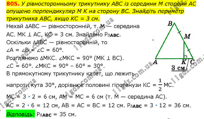 У рівносторонньому трикутнику ABC із середини M сторони AC опущено перпендикуляр M K на сторону BC. Знайдіть периметр трикутника ABC, якщо KC = 3 см. Нехай ∆АВС — рівносторонній, т. M — середина AC. MK ⊥ AC, KC = 3 см. Знайдемо P∆ABC. Оскільки ∆АВС — рівносторонній, то ∠A = ∠B = ∠C = 60°. Розглянемо ∆MKC. ∠MKC = 90° (MK ⊥ BC). ∠C = 60°. ∠MKC = 90° – 60° = 30°. В прямокутному трикутнику катет, що лежить напроти кута 30°, дорівнює половині гіпотенузи KC = 1/2 MC. MC = 3 ∙ 2 = 6 см, AM = MC = 6 см (т. M — середина AC). AC = 2 ∙ 6 = 12 см, AB = AC = BC = 12 см. P∆ABC = 3 ∙ 12 = 36 см. Відповідь: P∆ABC = 35 см.
