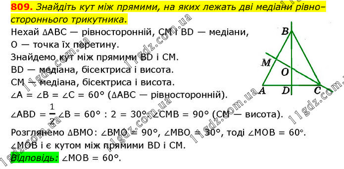 Знайдіть кут між прямими, на яких лежать дві медіани рівностороннього трикутника. Нехай ∆АВС — рівносторонній, CM і BD — медіани, O — точка їх перетину. Знайдемо кут між прямими BD і CM. BD — медіана, бісектриса і висота. CM — медіана, бісектриса і висота. ∠A = ∠B = ∠C = 60° (∆АВС — рівносторонній). ∠ABD = 1/2 ∠B = 60° : 2 = 30°. ∠CMB = 90° (CM — висота). Розглянемо ∆ВМО: ∠BMO = 90°, ∠MBO = 30°, тоді ∠MOB = 60°. ∠MOB і є кутом між прямими BD і CM. Відповідь: ∠MOB = 60°.