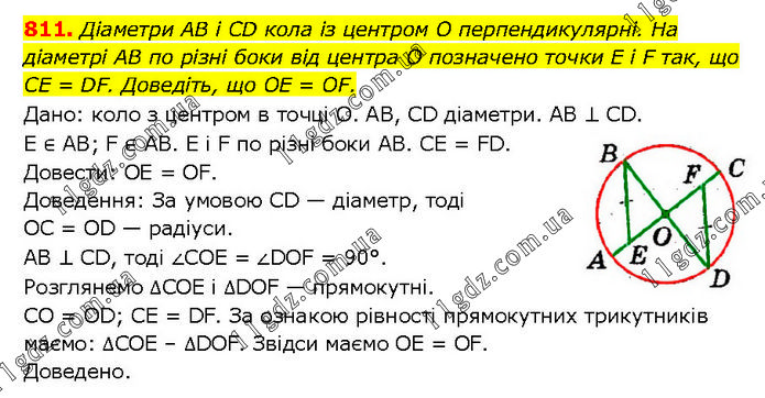Діаметри AB і CD кола із центром O перпендикулярні. На діаметрі AB по різні боки від центра O позначено точки E i F так, що CE = DF. Доведіть, що OE = OF. Дано: коло з центром в точці О. AB, CD діаметри. AB ⊥ CD. E ∈ AB; F ∈ AB. E і F по різні боки AB. CE = FD. Довести: OE = OF. Доведення: За умовою CD — діаметр, тоді OC = OD — радіуси. AB ⊥ CD, тоді ∠COE = ∠DOF = 90°. Розглянемо ∆COE і ∆DOF — прямокутні. CO = OD; CE = DF. За ознакою рівності прямокутних трикутників маємо: ∆COE – ∆DOF. Звідси маємо OE = OF. Доведено.