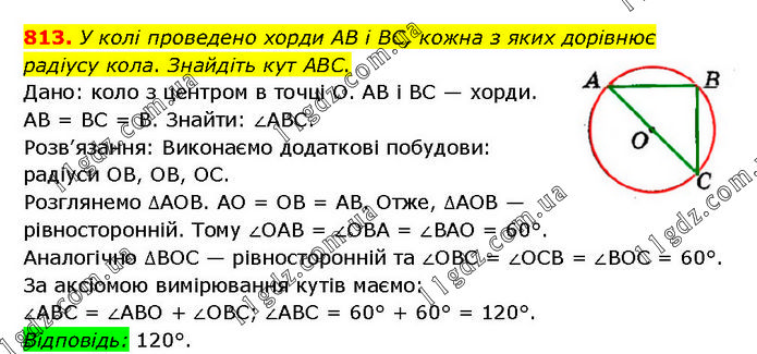 У колі проведено хорди AB і BC, кожна з яких дорівнює радіусу кола. Знайдіть кут ABC. Дано: коло з центром в точці О. AB і BC — хорди. AB = BC = В. Знайти: ∠ABC. Розв’язання: Виконаємо додаткові побудови: радіуси OB, OB, ОС. Розглянемо ∆АОВ. AO = OB = AB. Отже, ∆AOB — рівносторонній. Тому ∠OAB = ∠OBA = ∠BAO = 60°. Аналогічно ∆BOC — рівносторонній та ∠OBC = ∠OCB = ∠BOC = 60°. За аксіомою вимірювання кутів маємо: ∠ABC = ∠ABO + ∠OBC; ∠ABC = 60° + 60° = 120°. Відповідь: 120°.