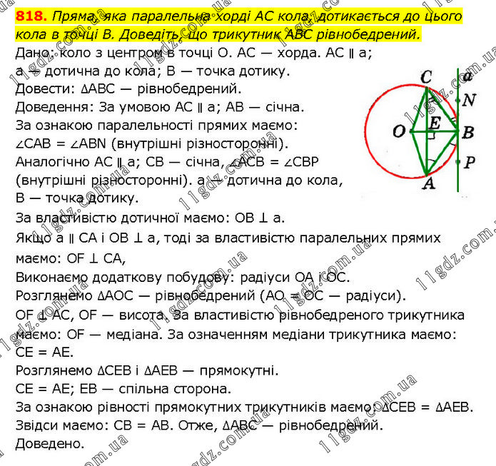 Пряма, яка паралельна хорді AC кола, дотикається до цього кола в точці В. Доведіть, що трикутник ABC рівнобедрений. Дано: коло з центром в точці О. AC — хорда. AC ∥ а; а — дотична до кола; В — точка дотику. Довести: ∆ABC — рівнобедрений. Доведення: За умовою AC ∥ a; AB — січна. За ознакою паралельності прямих маємо: ∠CAB = ∠ABN (внутрішні різносторонні). Аналогічно AC ∥ a; CB — січна, ∠ACB = ∠CBP (внутрішні різносторонні). а — дотична до кола, В — точка дотику. За властивістю дотичної маємо: OB ⊥ а. Якщо а ∥ CA і OB ⊥ а, тоді за властивістю паралельних прямих маємо: OF ⊥ CA, Виконаємо додаткову побудову: радіуси OA і ОС. Розглянемо ∆АОС — рівнобедрений (AO = OC — радіуси). OF ⊥ AC, OF — висота. За властивістю рівнобедреного трикутника маємо: OF — медіана. За означенням медіани трикутника маємо: CE = AE. Розглянемо ∆CEB і ∆AEB — прямокутні. CE = AE; EB — спільна сторона. За ознакою рівності прямокутних трикутників маємо: ∆CEB = ∆АЕВ. Звідси маємо: CB = AB. Отже, ∆АВС — рівнобедрений. Доведено.