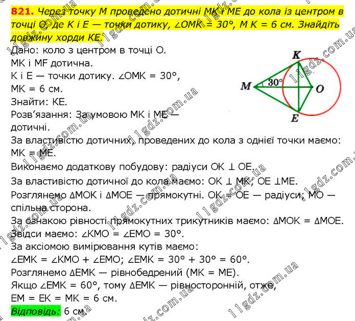Через точку M проведено дотичні MK і ME до кола із центром в точці О, де K і E — точки дотику, ∠OMK = 30°, MK = 6 см. Знайдіть довжину хорди КЕ. Дано: коло з центром в точці О. MK і MF дотична. K i E — точки дотику. ∠OMK = 30°, MK = 6 см. Знайти: КЕ. Розв’язання: За умовою MK і ME — дотичні. За властивістю дотичних, проведених до кола з однієї точки маємо: MK = ME. Виконаємо додаткову побудову: радіуси OK ⊥ OE. За властивістю дотичної до кола маємо: OK ⊥ MK; OE ⊥ME. Розглянемо ∆МОК і ∆MOE — прямокутні. OK = OE — радіуси; MO — спільна сторона. За ознакою рівності прямокутних трикутників маємо: ∆MOK = ∆MOE. Звідси маємо: ∠KMO = ∠EMO = 30°. За аксіомою вимірювання кутів маємо: ∠EMK = ∠KMO + ∠EMO; ∠EMK = 30° + 30° = 60°. Розглянемо ∆EMK — рівнобедрений (MK = ME). Якщо ∠EMK = 60°, тому ∆EMK — рівносторонній, отже, EM = EK = MK = 6 см. Відповідь: 6 см.